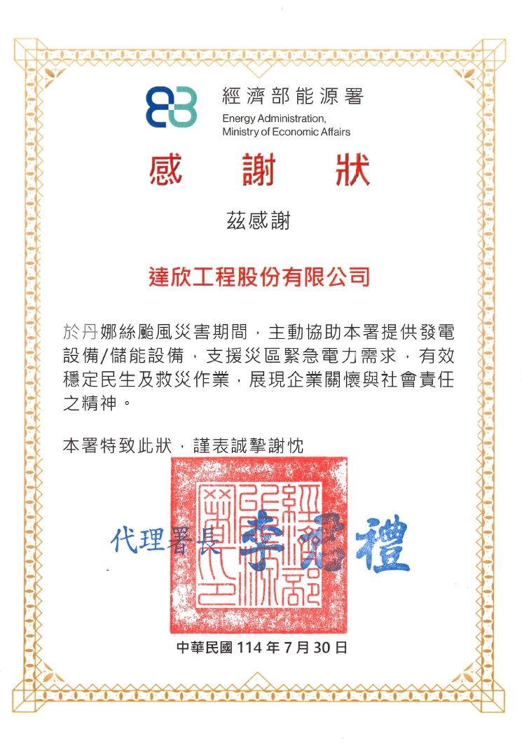 丹娜絲颱風災害期間,主動協助提供發電設備/儲能設備,支援災區緊急電力需求感謝狀