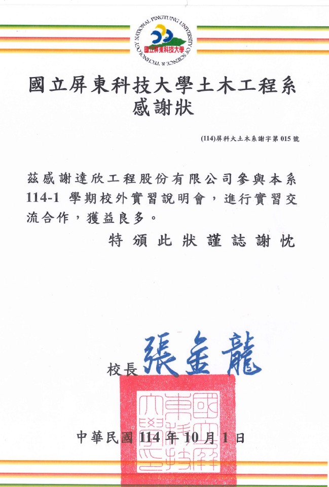 參與國立屏東科技大學土木工程系114-1學期校外實習說明會感謝狀