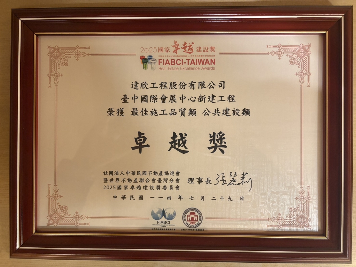 达欣工程金融服务专区新建工程荣获行政院劳工委员会安卫楷模奖