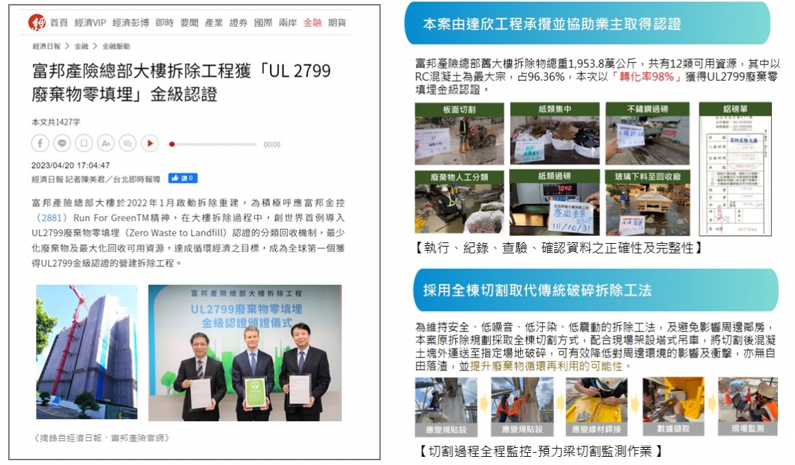 达欣工程承揽富邦产险大楼原址拆除,协助业主取得全球第一个UL2799(零废弃物填埋)金奖认证的营建拆除工程